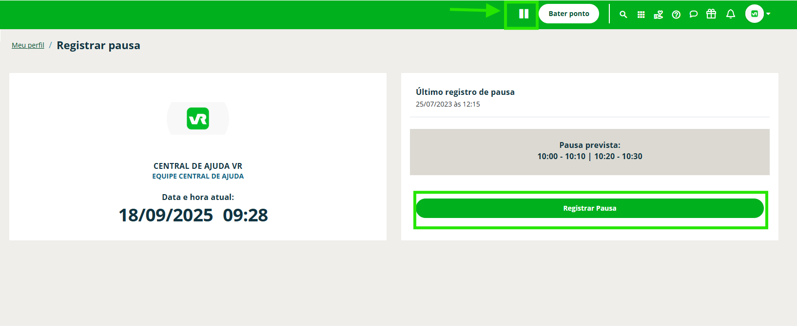 No ambiente web, você registra as pausas através do botão de Pausa no topo da tela ao lado esquerdo da lupa de pesquisa, na coluna superior do sistema.
