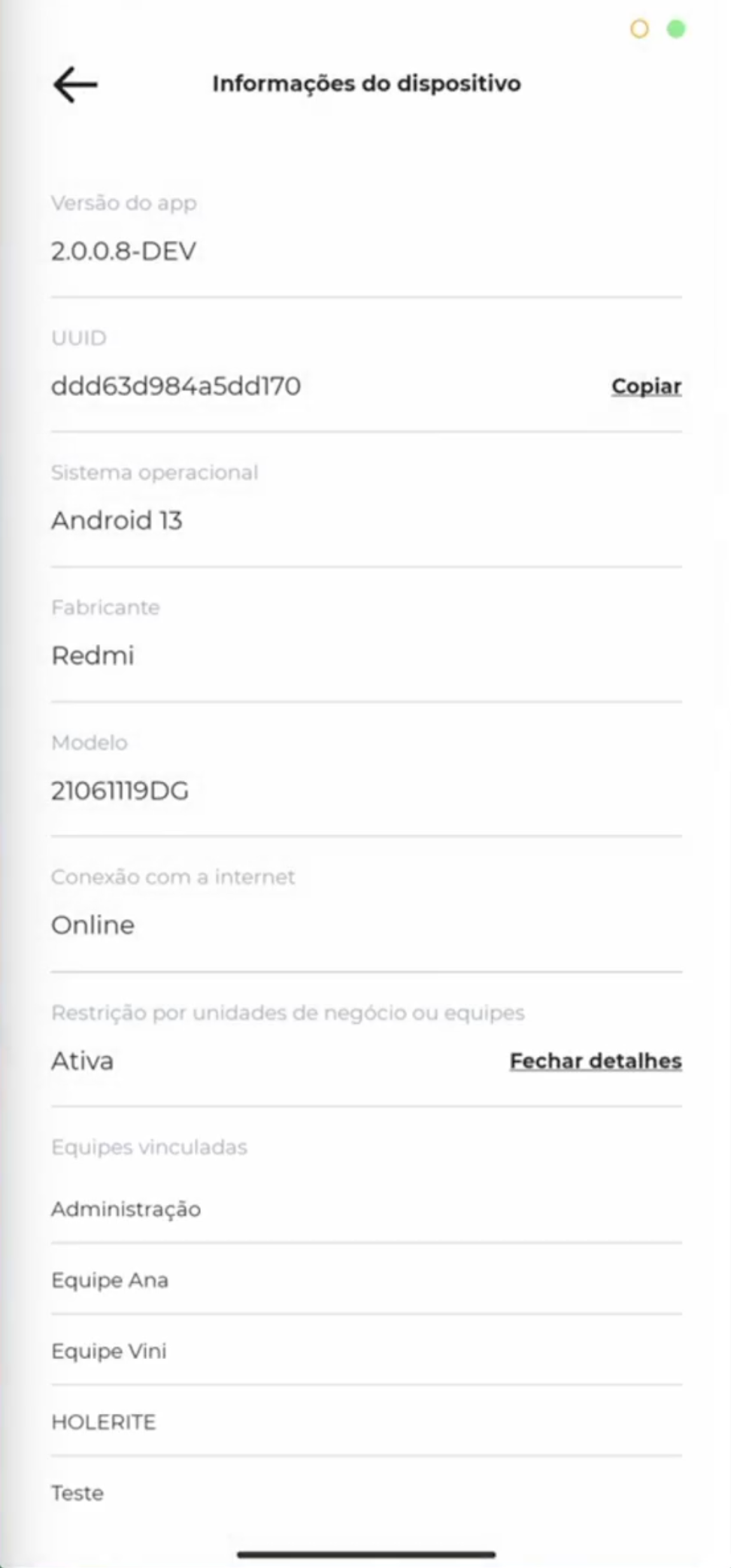 Na opção de informações do dispositivo você confere o UUID do aparelho, última atualização e modelo de seu dispositivo, essa funcionalidade é muito útil para consultar o detalhamento do celular/tablet.