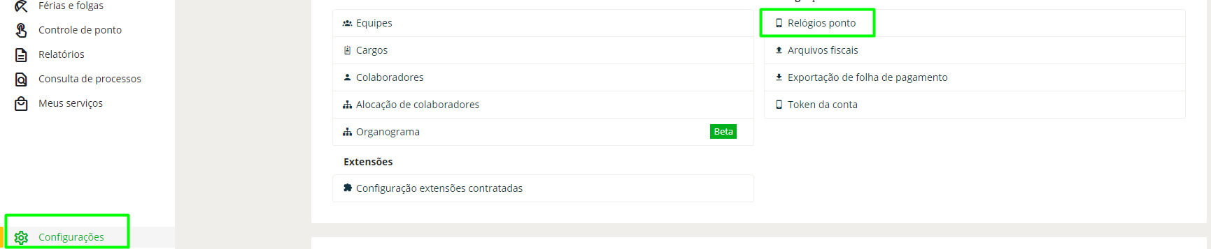 Passo 2: no quadro de Integrações selecione a opção “Relógios ponto”;