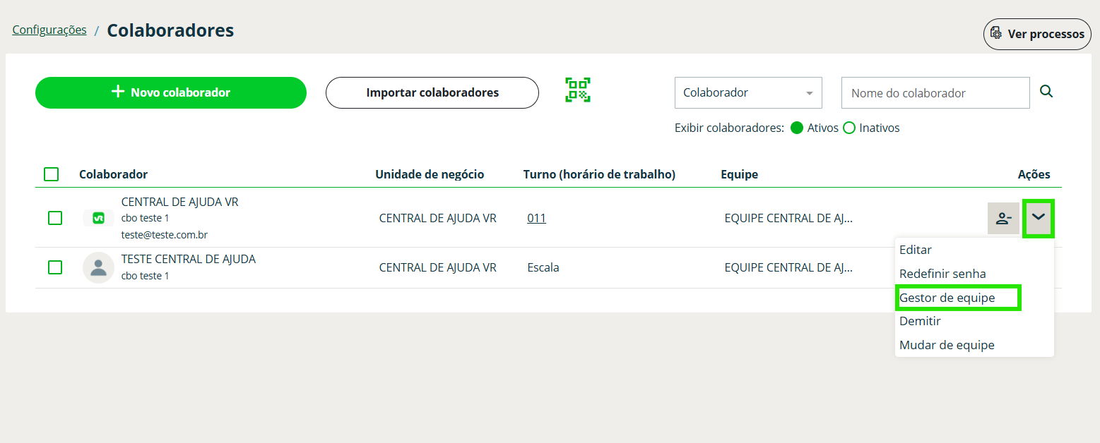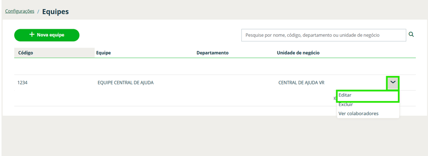 Passo 3: Localize a equipe que terá o gestor ou administrador no gerenciamento, e clique no ícone de seta para baixo ao lado direito do cadastro, e selecione Editar;