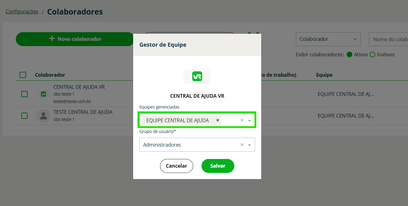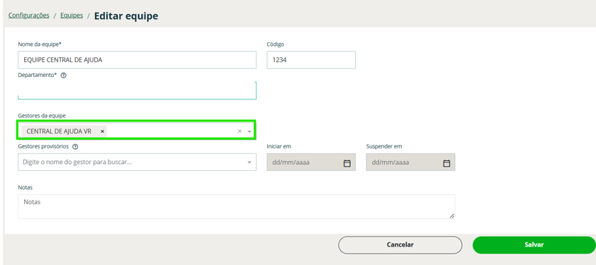 Passo 4: No campo Gestores da equipe adicione o gestor responsável da equipe, e se ele vai cobrir previamente uma ausência você pode seleciona-lo de forma temporária no campo Gestores provisórios, e Salvar!
