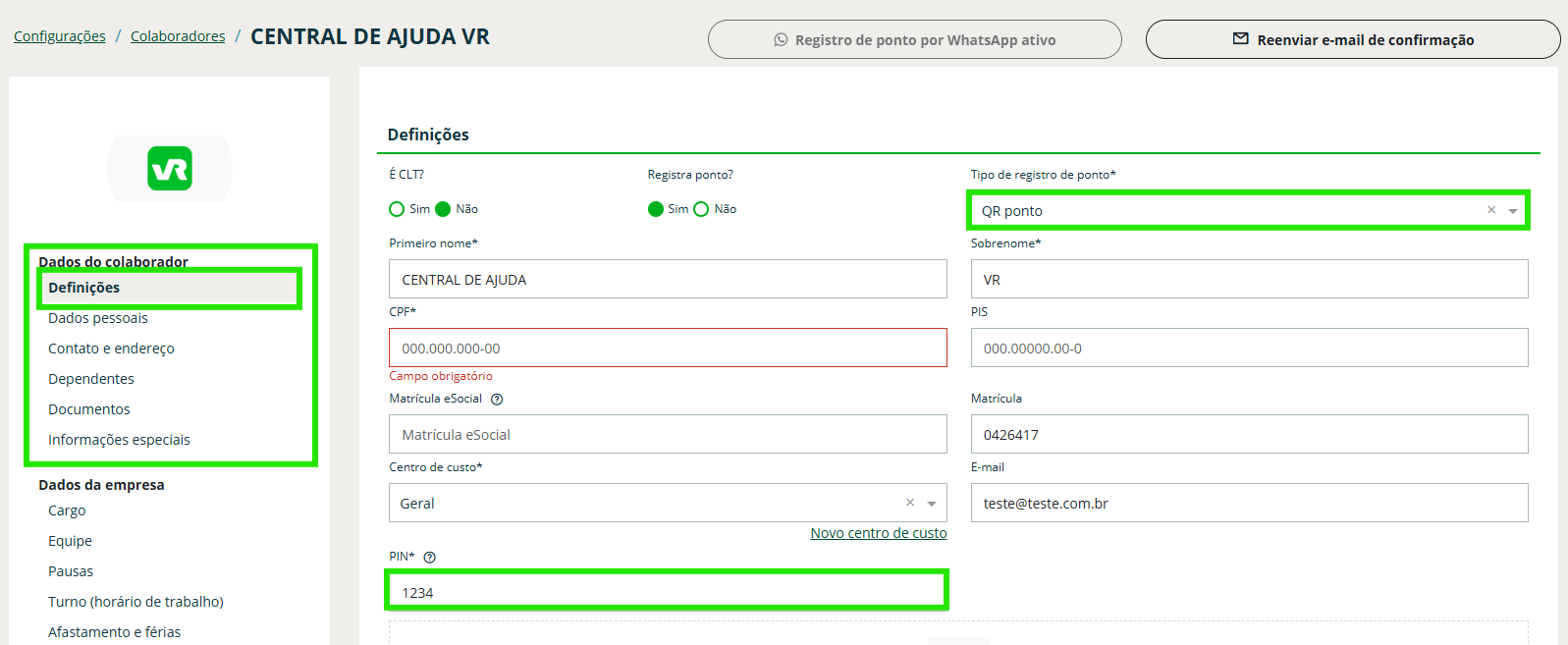 Passo 4: Na lista de Dados do colaborador, selecione Definições e defina o tipo de registro QR ponto no campo Tipo de registro de ponto;