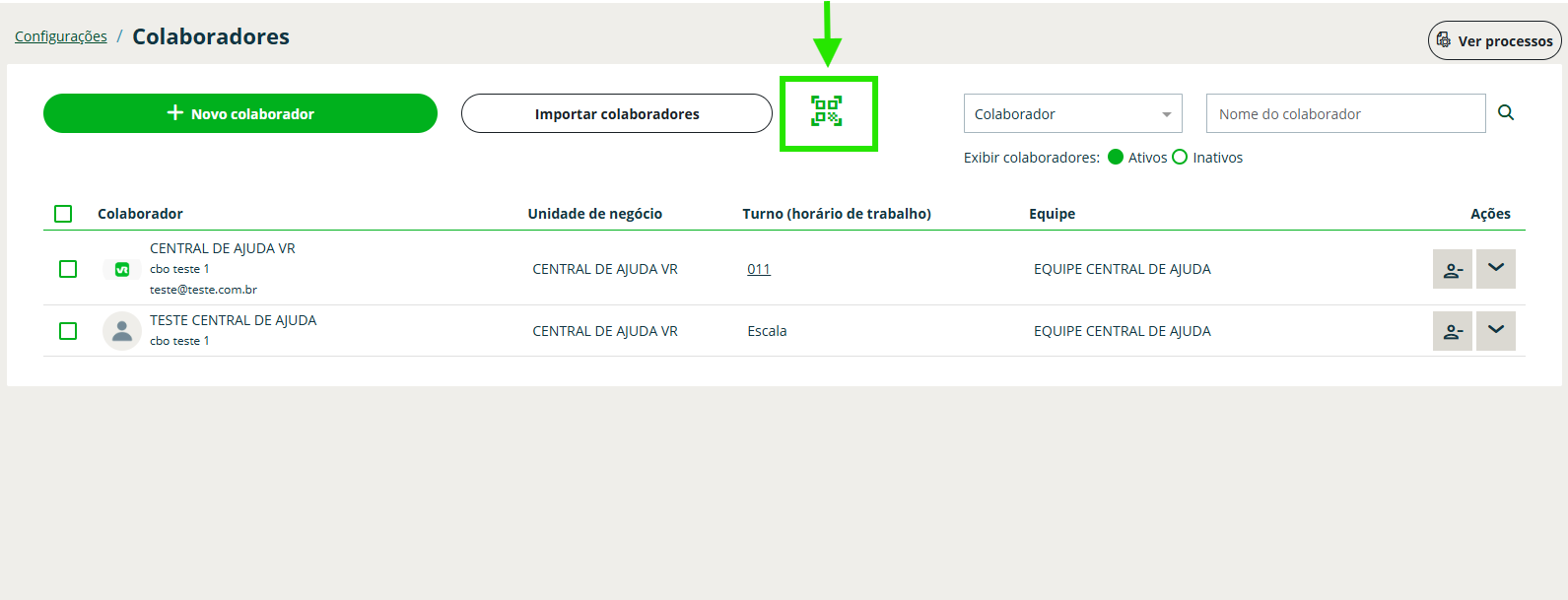 Passo 3: No topo da tela, existe um ícone com formato de QR Code ao lado do botão Importar Colaboradores. Clique nele.