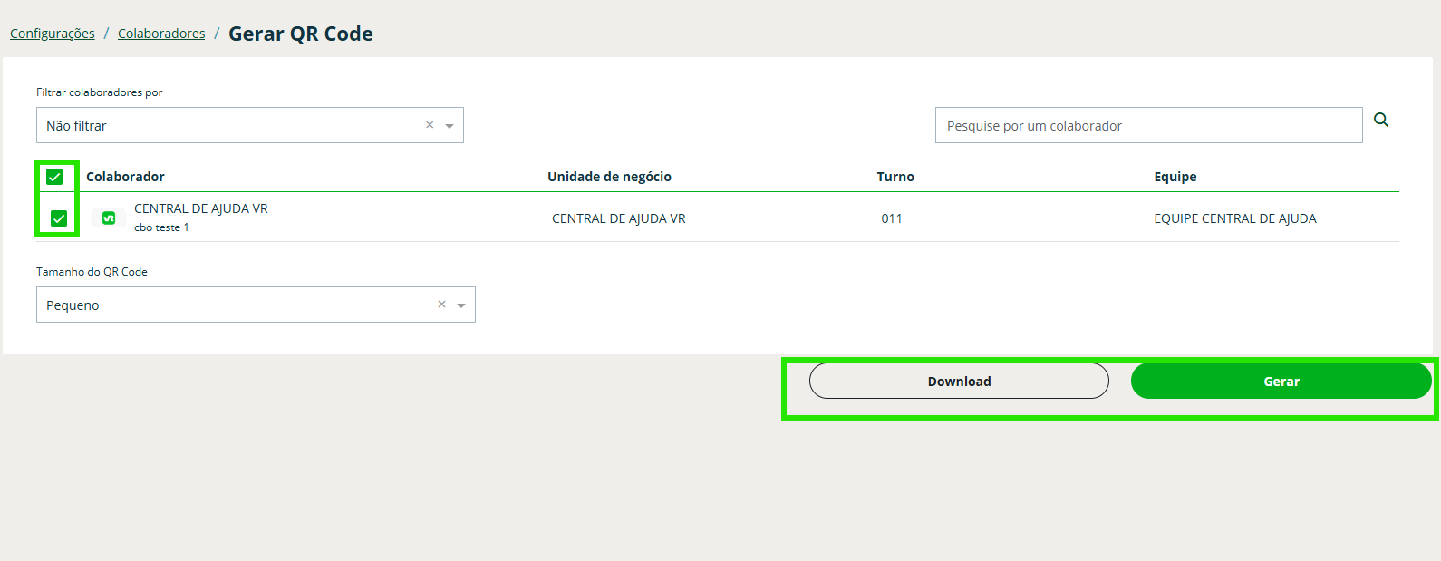 Passo 4: selecione os colaboradores que deseja gerar o código e clique em “Download” para baixar o arquivo com todos em seu computador ou “Gerar” para exibi-los em sua tela (você pode imprimir em sequência, se quiser).