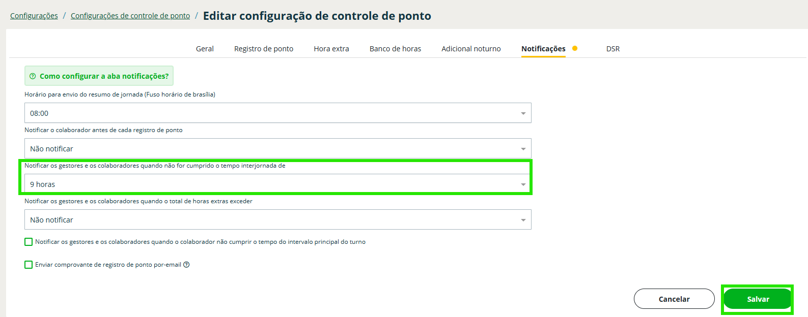 Passo 4: Defina o tempo em “Notificar os gestores e os colaboradores quando não for cumprido o tempo interjornada de” e Salvar!