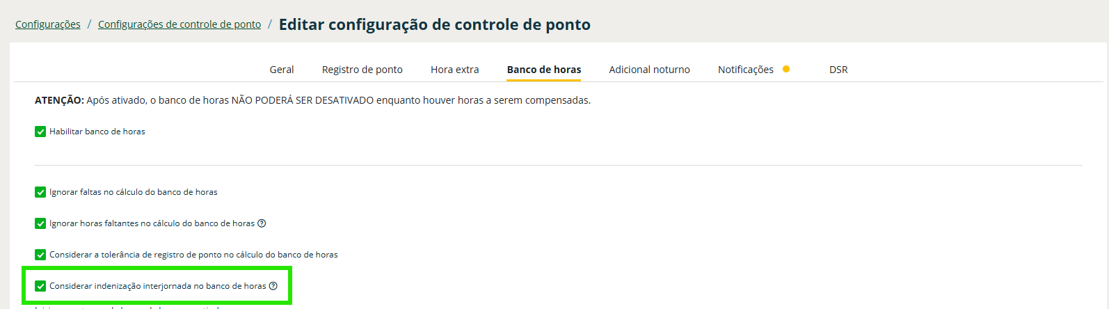 Se sua convenção permite a indenização das horas não descansadas como saldo positivo de banco de horas, habilite esse recurso em sua configuração do banco de horas.