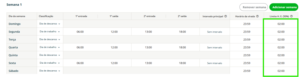 No exemplo abaixo, ao acessar um turno, se estiver preenchido como 02:00, significa que as duas primeiras horas serão computadas no fator de multiplicação 1.
