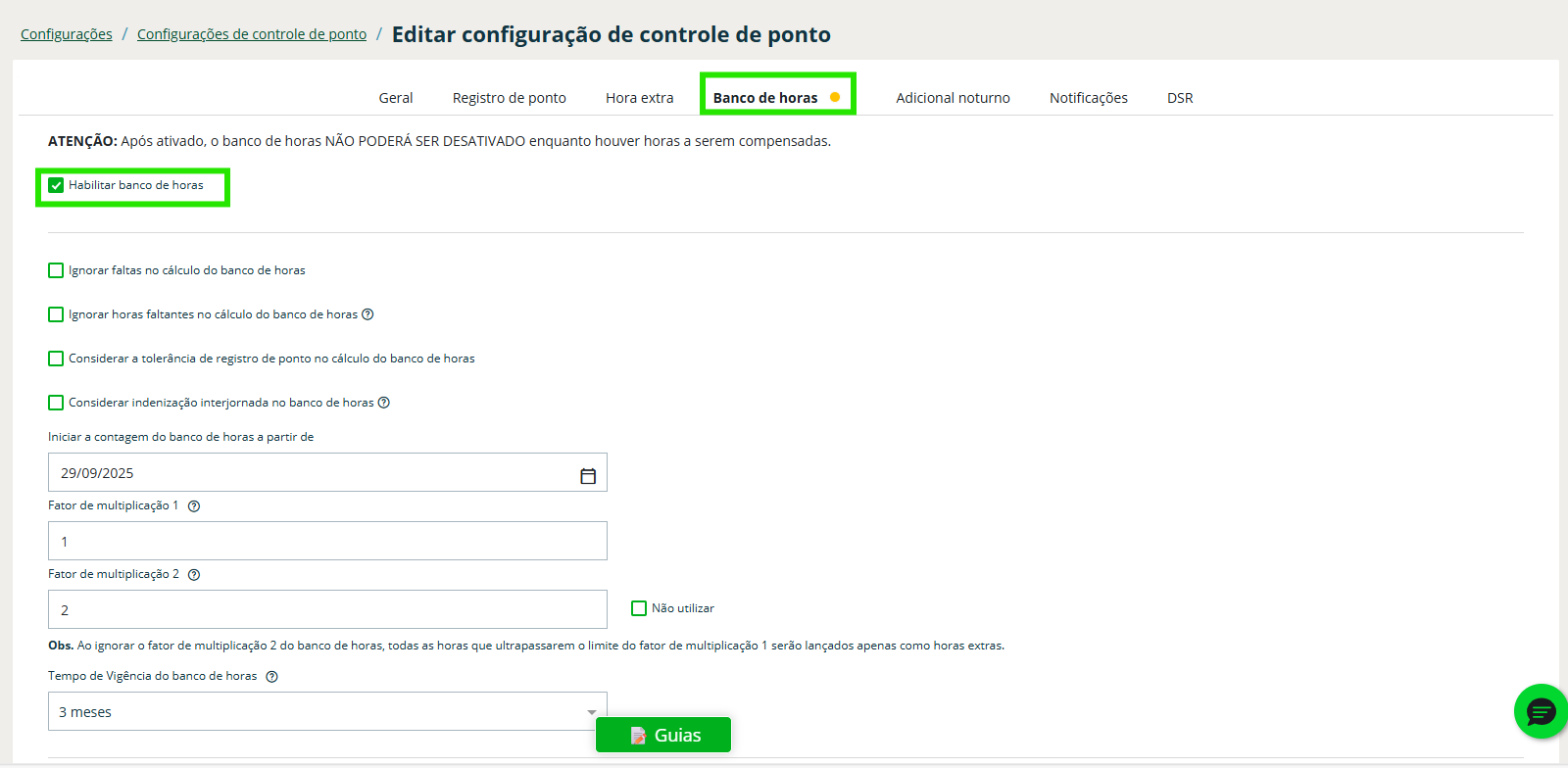 Passo 4: Clique em “Habilitar banco de horas”, configure os parâmetros e Salvar!