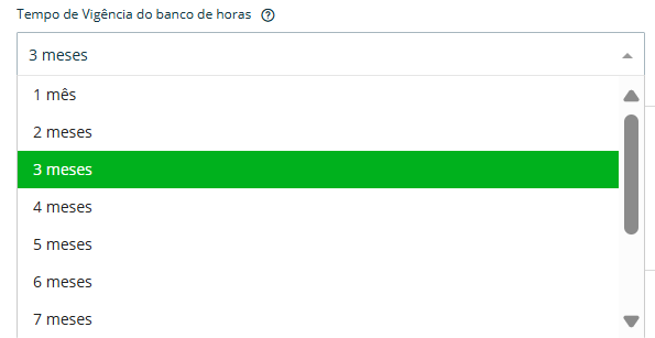 O tempo de vigência do banco de horas, é o período que a empresa possui previsto para realizar o pagamento do banco de horas. Insira o tempo que sua empresa realiza o pagamento do banco de horas regularmente.
