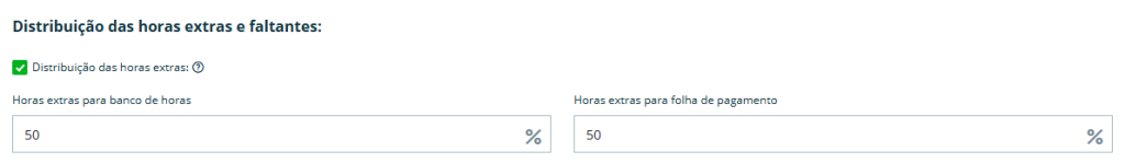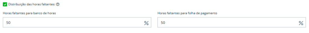 Se o primeiro campo de “Horas extras para banco de horas” for preenchido, o segundo campo de “Horas extras para folha de pagamento” é automaticamente calculado com a diferença até que complete 100%.