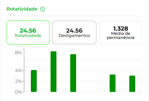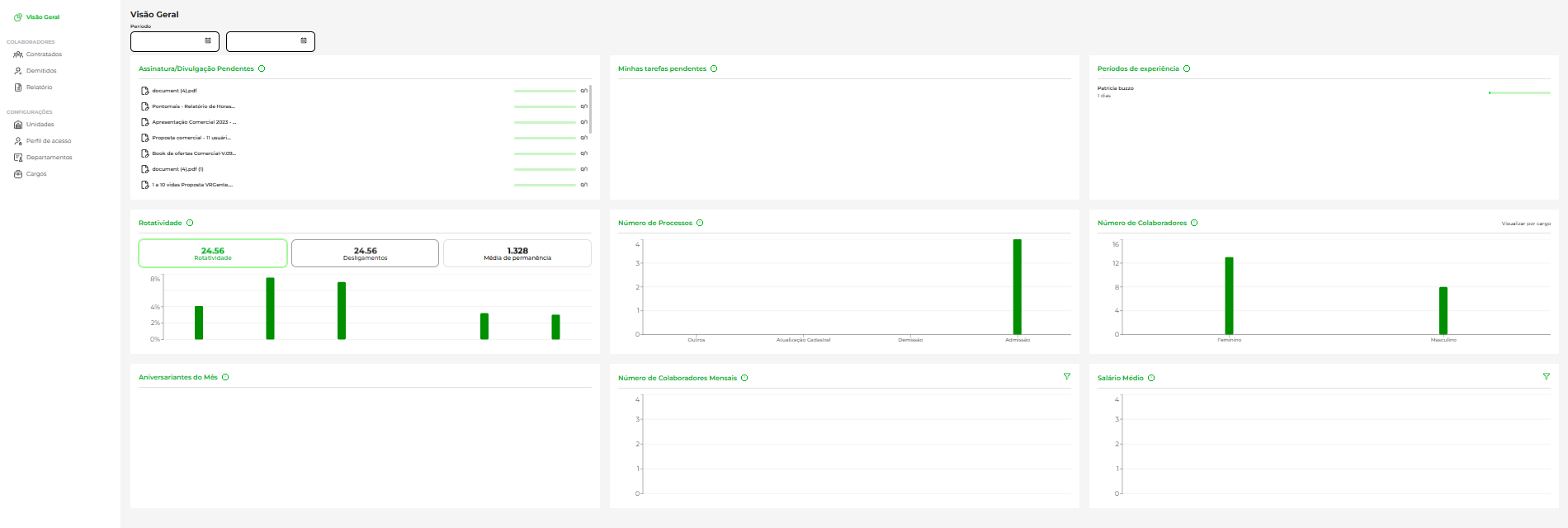 Módulo Admissão: Painel Visão GeralMaria VitoriaAdministrador, Admissão, Gestão de jornada O menu Visão Geral permite que você acompanhe os dados de seus colaboradores , assim como acompanhar em tempo real dashboards atualizados.Confira abaixo o passo a passo para visualizar o painel!Passo 1: No canto superior ao lado direito da tela, clique no ícone de Selecionar localizado ao lado esquerdo de sua foto cadastrada;Passo 2: Selecione o aplicativo Admissão;Passo 3: Após atualização da página, na coluna vertical a esquerda, clique em Visão Geral Significado de quadros Assinatura/Divulgações Pendente Lista de documentos que estão pendentes de assinatura ou visualização cadastrados no módulo GED Minhas tarefas pendentesSão as tarefas cadastradas nas etapas dos fluxos no módulo Admissão.Essa tarefa está pendente de validação do RH. Períodos de experiênciaContabilizado a partir da data de admissão cadastrada no módulo Admissão RotatividadeMede a relação de colaboradores demitidos em um intervalo do tempo especifico no módulo de Admissão. Número de processos Quantidade de processos ativos e concluídos agrupados por tipo (Admissão, Demissão e outros) Numero de ColaboradoresColaboradores ativos cadastrados no módulo Admissão Aniversariantes do mêsAniversariantes com data de nascimento informada em cadastro no módulo Admissão. Número de colaboradores mensais Número de colaboradores que foram admitidos e estão ativos dentro do mês no módulo Admissão. Salário MédioMédia salarial total de todos os cadastros dos colaboradores no módulo Admissão. Tem dúvidas e é gestor ou administrador do sistema? Estamos à disposição pelo chat na área logada, de segunda a sexta, das 09h às 18h. Was this article helpful?YesNo Tags# ADMISSÃO