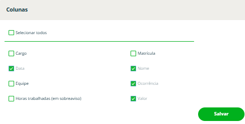 No botão “Colunas” é possível incluir ou remover as colunas de dados gerados por esse relatório.