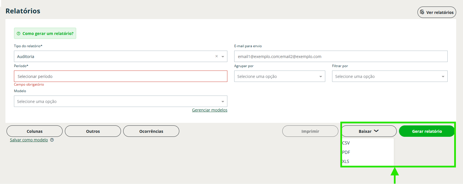 Passo 3: no campo “Tipo de relatório”, selecione a opção “Auditoria”.