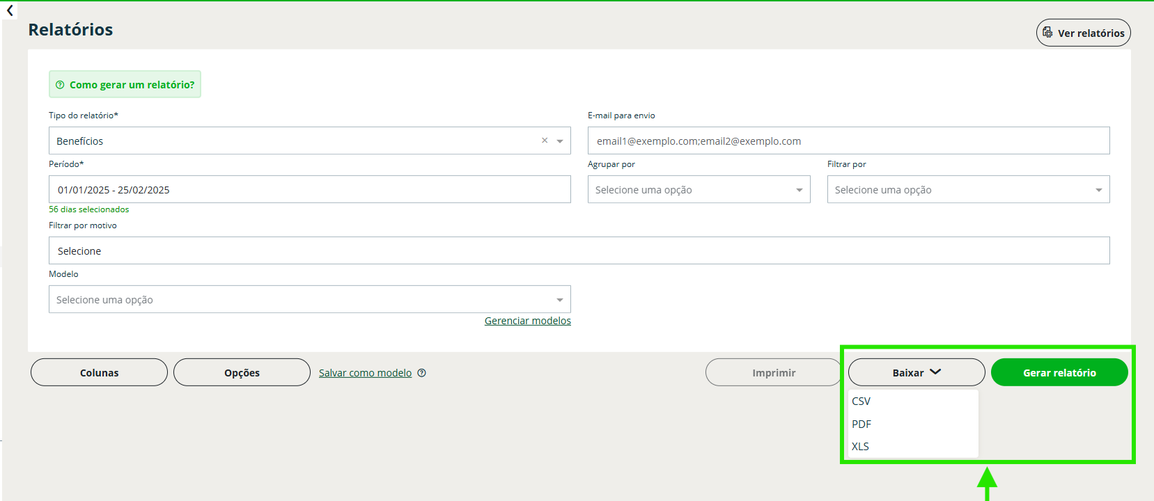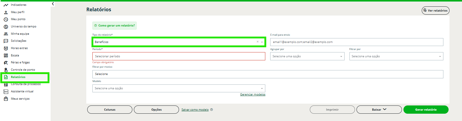Passo 3: no campo “Tipo de relatório”, selecione a opção “Benefícios”.