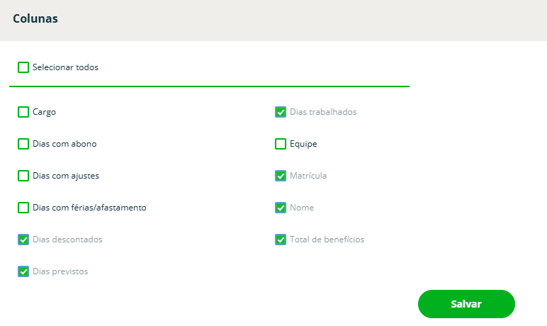 É importante destacar que para gerar os valores em relatório, o sistema levará em consideração os filtros adicionados e irá gerar a quantidade de dias trabalhados que deverão ser pagos de benefícios ao colaborador.