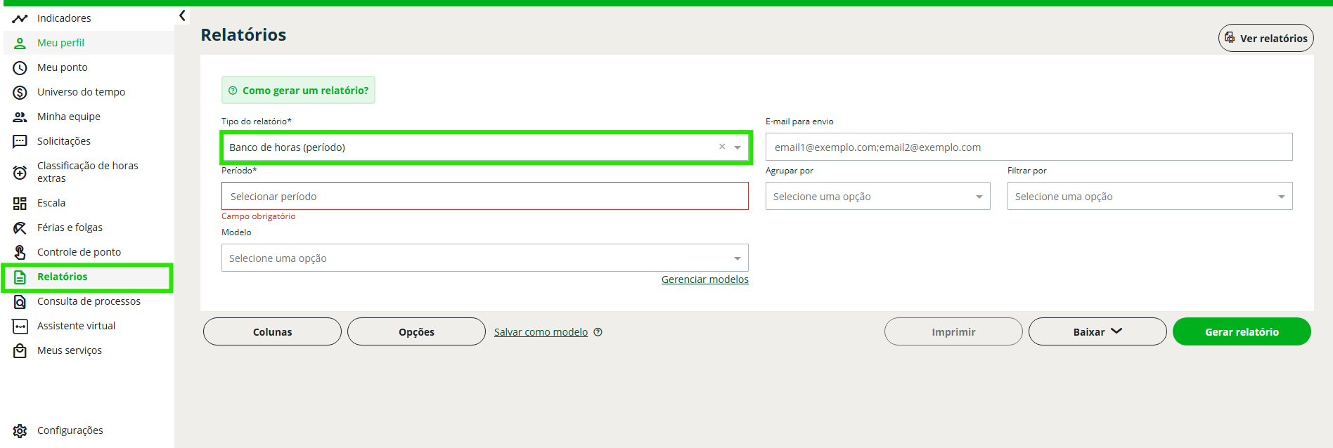 Passo 3: no campo “Tipo de relatório”, selecione a opção “Banco de horas (período)”.