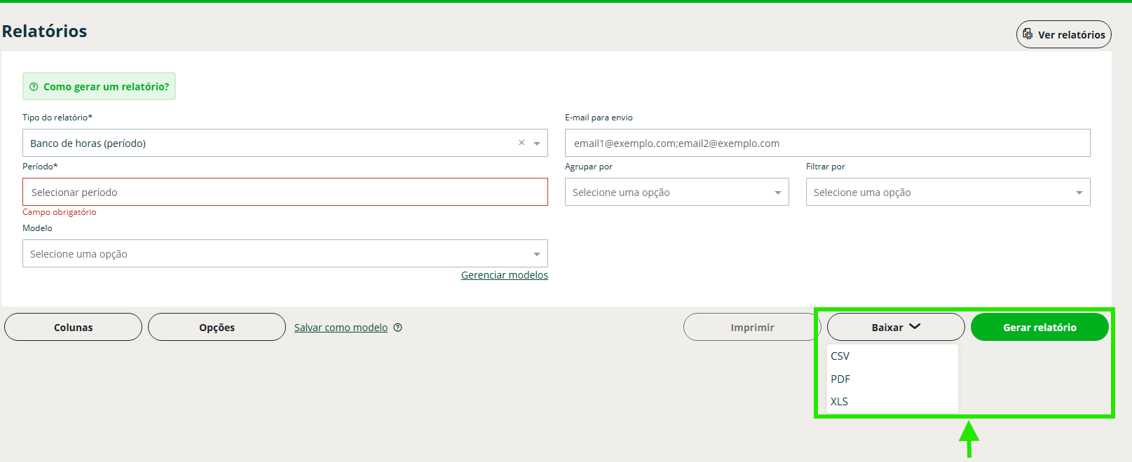 Gerar relatório: permite visualizar o relatório em tela, sem realizar o donwload do relatório em formato de arquivo