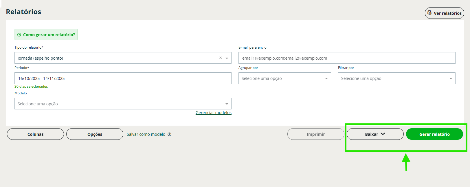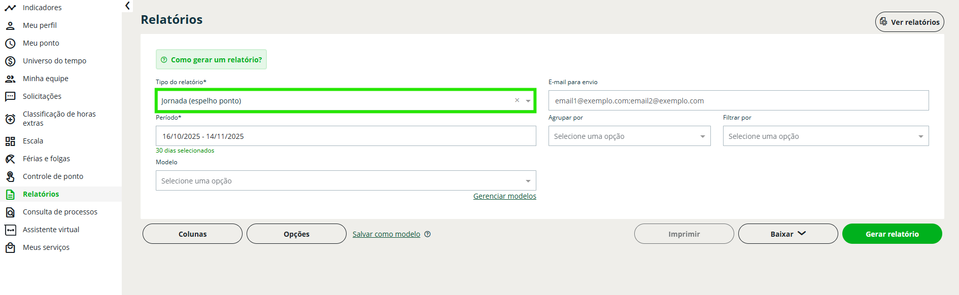 Passo 3: no campo “Tipo de relatório”, selecione a opção “Jornada (espelho ponto)”.