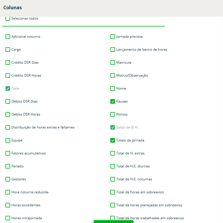 No botão “Colunas” é possível incluir ou remover as colunas de dados gerados por esse relatório.