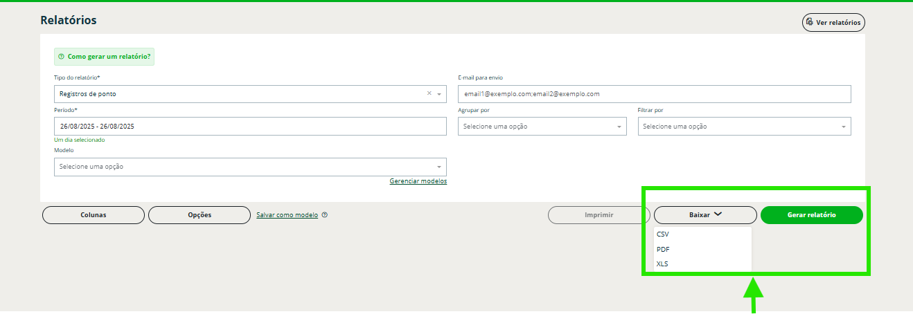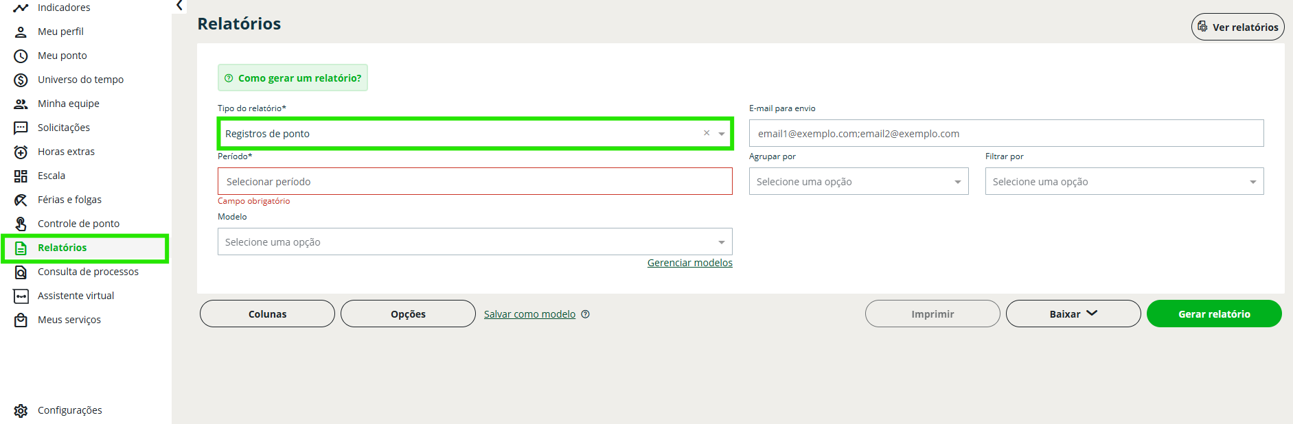 Passo 3: no campo “Tipo de relatório”, selecione a opção “Registros de Ponto”.