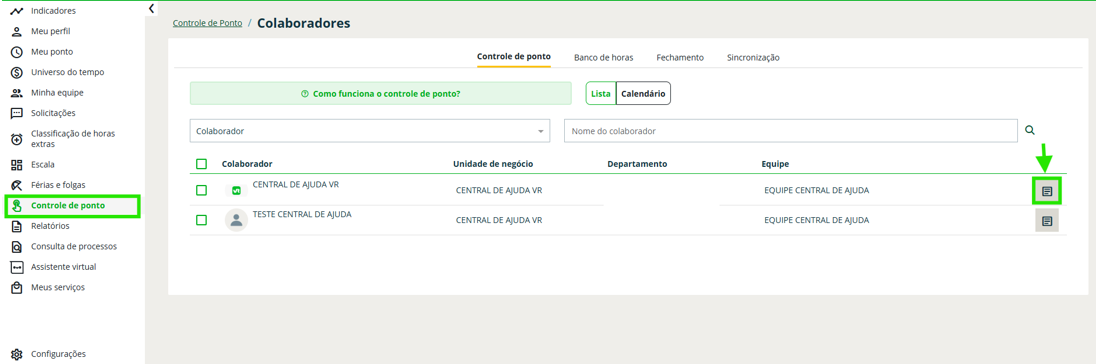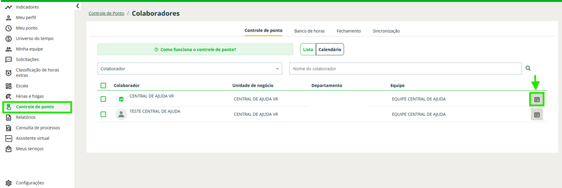 Passo 2: Localize o colaborador e clique no ícone de lista ao lado direito do cadastro;