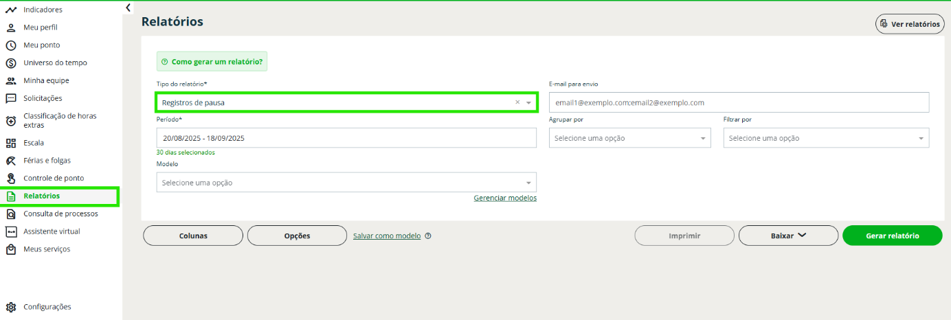 Passo 3: no campo “Tipo de relatório”, selecione a opção “Registros de Pausa”;